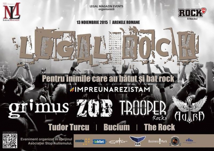 Două concerte caritabile menite să strângă fonduri pentru victimele incendiului ce a avut loc în clubul "Colectiv" sunt programate în acest weekend, la Arenele Romane din Bucureşti. "Legal Rock" este un spectacol reprogramat pe 13 noiembrie, după evenimentul tragic din Colectiv, prin alăturarea organizatorilor grupului de ajutor "#ÎmpreunăRezistăm". Grimus, ZOB, Trooper, AURA, Tudor Turcu, Bucium şi The R.O.C.K (o trupă tribut AC/DC) vor urca vineri pe scenă, într-un concert care va îmbina genurile hard-rock şi rock alternativ. Evenimentul a fost iniţial organizat pentru sprijinirea Asociaţiei Stop Autismului, însă după reprogramare organizatorii au anunţat că o parte din veniturile obţinute vor fi donate Fundaţiei Estuar pentru victimele din Colectiv. Trebuie precizat că gazda evenimentului este cunoscutul rocker Cristi Hrubaru, de la emisiunea Cronica Cârcotaşilor. Biletele pot fi găsite în reţelele www.iabilet.ro şi www.eventim.ro, inclusiv în ziua concertului (la intrare) şi costă 39 de lei, până în ziua evenimentului şi 50 de lei pe 13 noiembrie. Porţile se deschid la ora 18.00, iar prima trupă va urca pe scenă după ora 19.00.