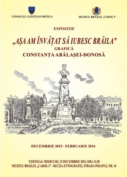 Secţia de Etnografie a Muzeului Brăilei "Carol I" găzduieşte începând de miercuri, de la orele 12.30, expoziţia de grafică a artistei Constanţa Abălaşei - Donosă, intitulată "Aşa am învăţat să iubesc Brăila".