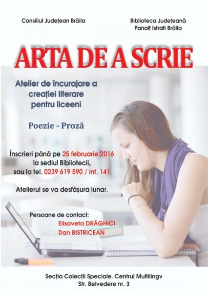 Clubul "Arta de a scrie" este destinat tinerilor preocupaţi de cultivarea şi educarea gustului pentru literatură în vederea dezvoltării personale, îmbunătăţirea performanţelor şcolare, dezvoltarea creativităţii şi imaginaţiei.