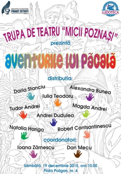 Trupa de teatru "Micii Poznaşi" a Bibliotecii Judeţene „Panait Istrati" Brăila prezintă sâmbătă, 19 decembrie, ora 10.00, piesa "Aventurile lui Păcală". Spectacolul este coordonat de actorii Ioana Zărnescu şi Dan Mecu. Din distribuţie fac parte copiii: Daria Stanciu, Iulia Teodoru, Alexandra Bunea, Tudor Andrei, Magda Andrei, Andrei Dudulea, Natalia Hariga, Robert Constantinescu.