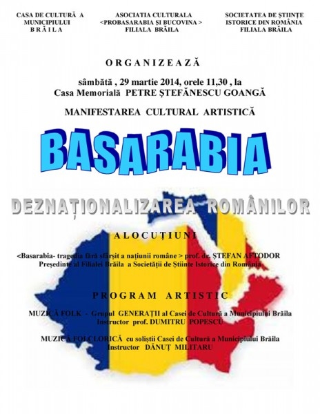 Casa de Cultură a Municipiului Brăila, în colaborare cu Asociaţia "ProBasarabia şi Bucovina" şi Societatea de Ştiinţe Istorice din România, filiala Brăila, organizează manifestarea cultural-artistică "Basarabia - Deznaţionalizarea românilor", prilejuită de împlinirea a 96 de ani de la Unirea Basarabiei cu România.