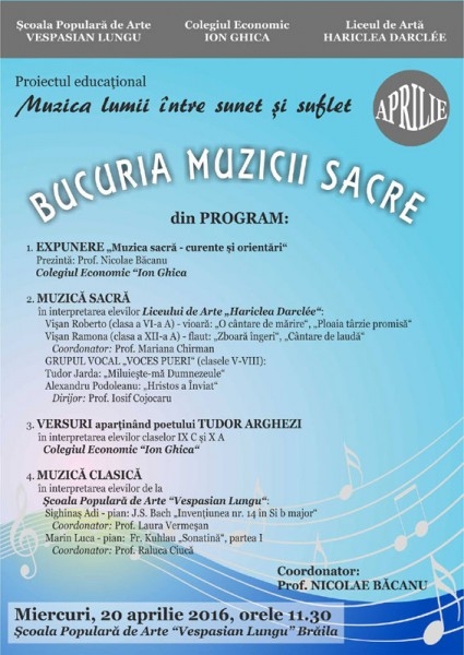 Miercuri, 20 aprilie, de la ora 11.30, la Şcoala Populară de Arte "Vespasian Lungu" Brăila va avea loc spectacolul " Bucuria muzicii sacre".