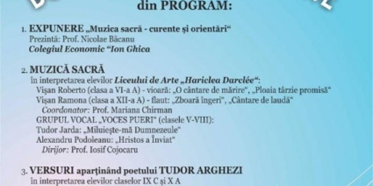 Programul cuprinde o expunere a prof. Nicolae Băcanu de la Colegiul Economic "Ion Ghica" despre muzica sacră-curente şi orientări; un program de muzică sacră, în interpretarea elevilor Liceului de Arte " Hariclea Darclee"; versuri aparţinând poetului Tudor Arghezi, în interpretarea elevilor de la Colegiul Economic "Ion Ghica"; şi muzică clasică, în interpretarea elevilor de la Şcoala Populară de Arte "Vespasian Lungu".