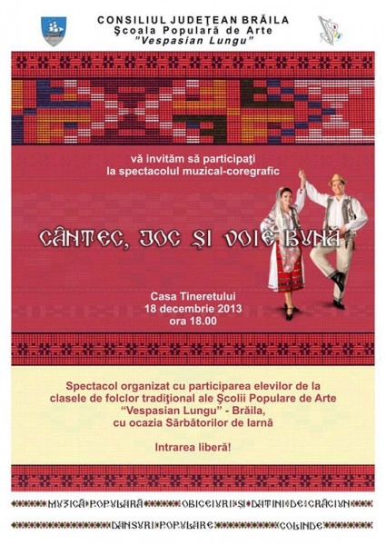 Casa Tineretului va găzdui, joi, de la ora 18.00, un spectacol muzical - coregrafic de folclor românesc, intitulat "Cântec, joc şi voie bună!". Spectactorii prezenţi se vor putea bucura de un bogat program de muzică şi dansuri populare, de obiceiuri şi datini româneşti despre sărbătorile de iarnă, din zona Brăilei.