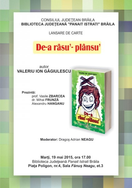 Mâine, de la ora 17.00, la Biblioteca Judeţeană "Panait Istrati" se va lansa cel de-al patrulea volum semnat de scriitorul brăilean Valeriu Găgiulescu. Cartea "De-a râsu - plânsu" va fi prezentată de profesorul Vasile Zbarcea, dr. Mihai Frunză şi epigramistul Alexandru Hanganu. Evenimentul va fi moderat de directorul bibliotecii, Dragoş Neagu.