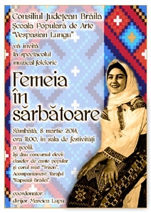 Sâmbătă, de Ziua Internaţională a Femeii, începând cu ora 11.00, în Sala de festivităţi a Şcolii Populare de Arte "Vespasian Lungu" va avea loc spectacolul muzical - folcloric "Femeia în sărbătoare". Programul muzical oferit tuturor doamnelor şi domnişoarelor va fi prezentat de elevii claselor de canto popular, coordonaţi de profesorii Adriana Toma şi Marieta Ion, elevii claselor de instrumente folclorice, profesori Mircea Nicolae şi Cristian Şonea, cursanţii clasei de ansamblu coral împreună cu membrii Corului mixt "Trison", dirijor Marcica Lupu. Acompaniamentul spectacolului va fi asigurat de instrumentiştii Tarafului "Rapsozii Brăilei" al Şcolii Populare de Arte "Vespasian Lungu", dirijor Cristian Ţonea, iar coordonarea spectacolului este realizată de prof. Marcica Lupu. Intrarea este liberă.