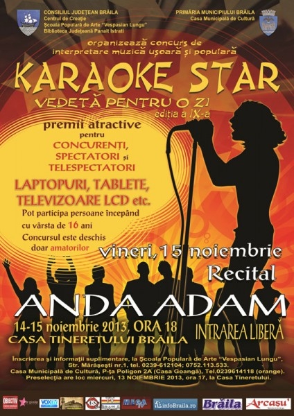 Joi se dă startul celei de-a IX-a ediţii a concursului de interpretare muzică uşoară "Karaoke Star - Vedetă pentru o zi" de la Brăila. Acesta se desfăşoară timp de două zile, pe 14 şi 15 noiembrie, de la ora 18.00 până la 21.30, la Casa Tineretului. În ultima seară a concursului este programat un recital Anda Adam.