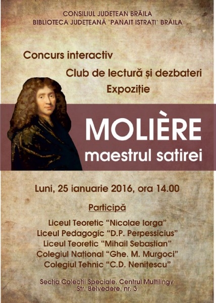 Biblioteca Judeţeană „Panait Istrati" Brăila organizează luni, 25 ianuarie 2016, ora 14.00, Concursul interactiv „Molière - maestrul satirei", la care participă elevi de la Liceul Teoretic „Nicolae Iorga", Liceul Pedagogic „D.P. Perpessicius", Liceul Teoretic „Mihail Sebastian", Colegiul Naţional „Gh. M. Murgoci", Liceul Tehnic „C.D. Neniţescu".