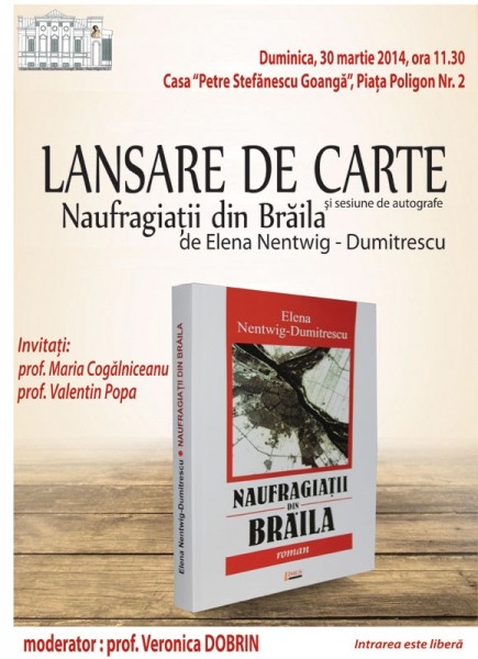 Duminică, de la ora 11.30, în Casa memorială "Petre Ştefănescu Goangă" se lansează cartea "Naufragiaţii din Brăila", scrisă de Elena Nentwig-Dumitrescu şi tipărită la editura Limes din Cluj. Vor prezenta volumul profesorii: Maria Cogălniceanu şi Valentin Popa. Moderator va fi prof. Veronica Dobrin.