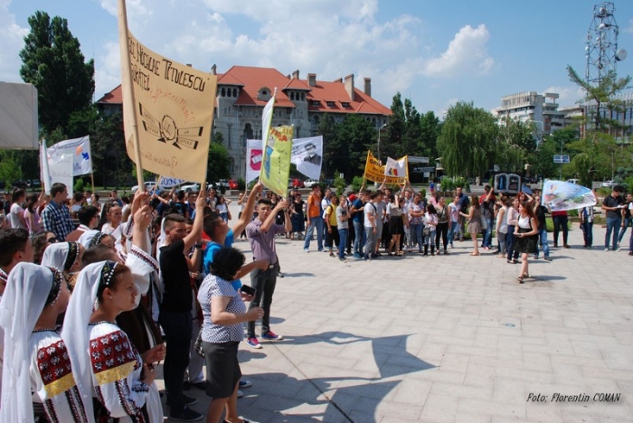 La ora 14.30, au plecat în coloană din faţa Sălii Polivalente spre platoul din faţa Primăriei. Pe drum, fiecare grup şi-a strigat numele liceului de care aparţinea.
