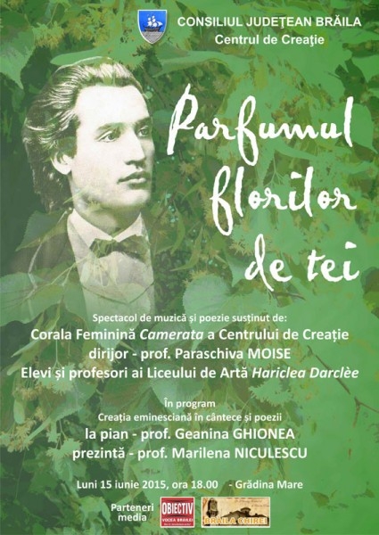 Spectacolul de muzică şi poezie va fi susţinut de Corala Feminină "Camerata" a Centrului de Creaţie, dirijor prof. Paraschiva Moise, şi de elevi şi profesori ai Liceului de Artă "Hariclea Darclee". În program va fi creaţia eminesciană în cântece şi poezii. Prof. Geanina Ghionea va cânta la pian, evenimentul fiind prezentat de prof. Marilena Niculescu.