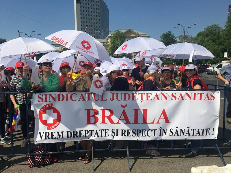 “Suntem la protest, la Bucureşti. Sindicatul Judeţean «Sanitas» Brăila a venit cu 150 persoane. Sunt oameni din toate spitalele brăilene”, ne-a declarat Măriuca Iancu, preşedintele “Sanitas” Brăila, joi. Potrivit presei centrale, cadrele medicale prezente la mitingul din Bucureşti erau revoltate că salariile le-au scăzut cu sume cuprinse între 500 şi 1.100 lei. “Sunt scăderi uriaşe. Unele merg de la 500 lei până la 1.100 lei. Sunt schimbări uriaşe din cauza neîncadrării în acel 85%, mulţi nici nu pot atinge pragul de 55-85%. Toţi le ştiu pe toate, dar nimeni nu înţelege nimic, iar vinovaţii de serviciu sunt cei care luptă pentru oameni. (...) Atunci când noi am cerut ca legea să fie modificată, nu cum ne doream noi, ci cum trebuia să fie la acel moment, nu a fost făcută. Cerem creştere salarială pentru toţi colegii noştri din sistemul de sănătate. (...) Păcat de lege, că am ajuns astăzi să spunem că mai bine nu eram de acord cu această creştere salarială. Este extrem de complexă şi este un haos total”, a spus Leonard Bărăscu, preşedintele Sindicatului “Sanitas”, după luarea deciziei de organizare a protestelor, citat de Mediafax.