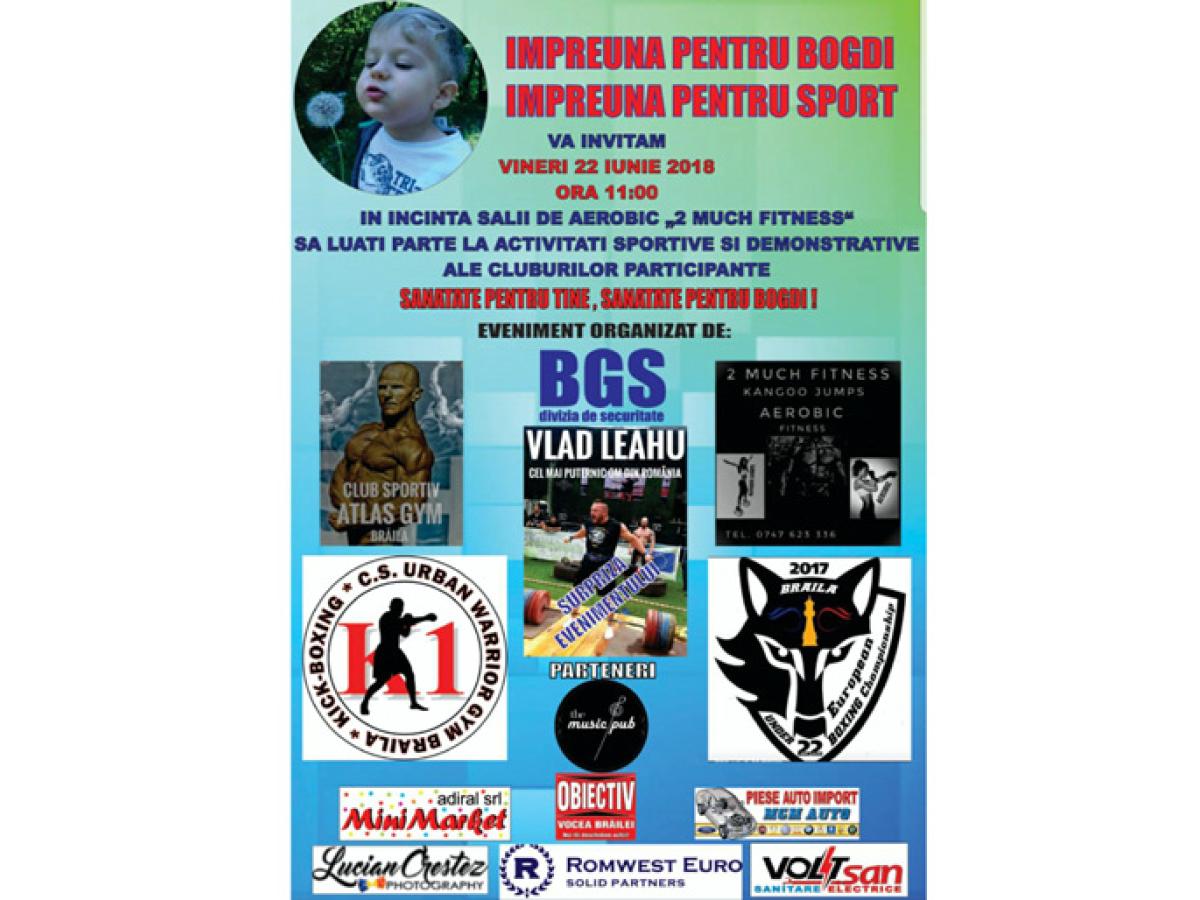 Compania de pază şi protecţie BGS strânge cele mai puternice cluburi sportive din Brăila, vineri, în Grădina Publică, într-o campanie de promovare a sănătăţii prin sport, dar şi de strângere de fonduri pentru Bogdi. Evenimentul se va desfăşura sub sloganul “Sănătate pentru tine, sănătate pentru Bogdi”, în incinta sălii de aerobic “2 Much Fitness”, între orele 11.00 - 14.00. Cluburile participante sunt: Club Sportiv “Atlas Gym” Brăila, Club Sportiv “Urban Warrior Gym” Brăila, “2 Much Fitness” şi C.S.M. Brăila. Acestea au pregătit activităţi sportive şi demonstrative, iar surpriza evenimentului va fi Vlad Leahu, cel mai puternic sportiv din România. Leahu va demonstra că îşi merită acest titlu, ridicând greutăţi. Cei mai curajoşi şi curioşi spectatori pot încerca activităţile sportive pregătite în cadrul evenimentului, şi aici ne referim la kickboxing, kagoo jumps, aerobic, fitness, culturism etc.