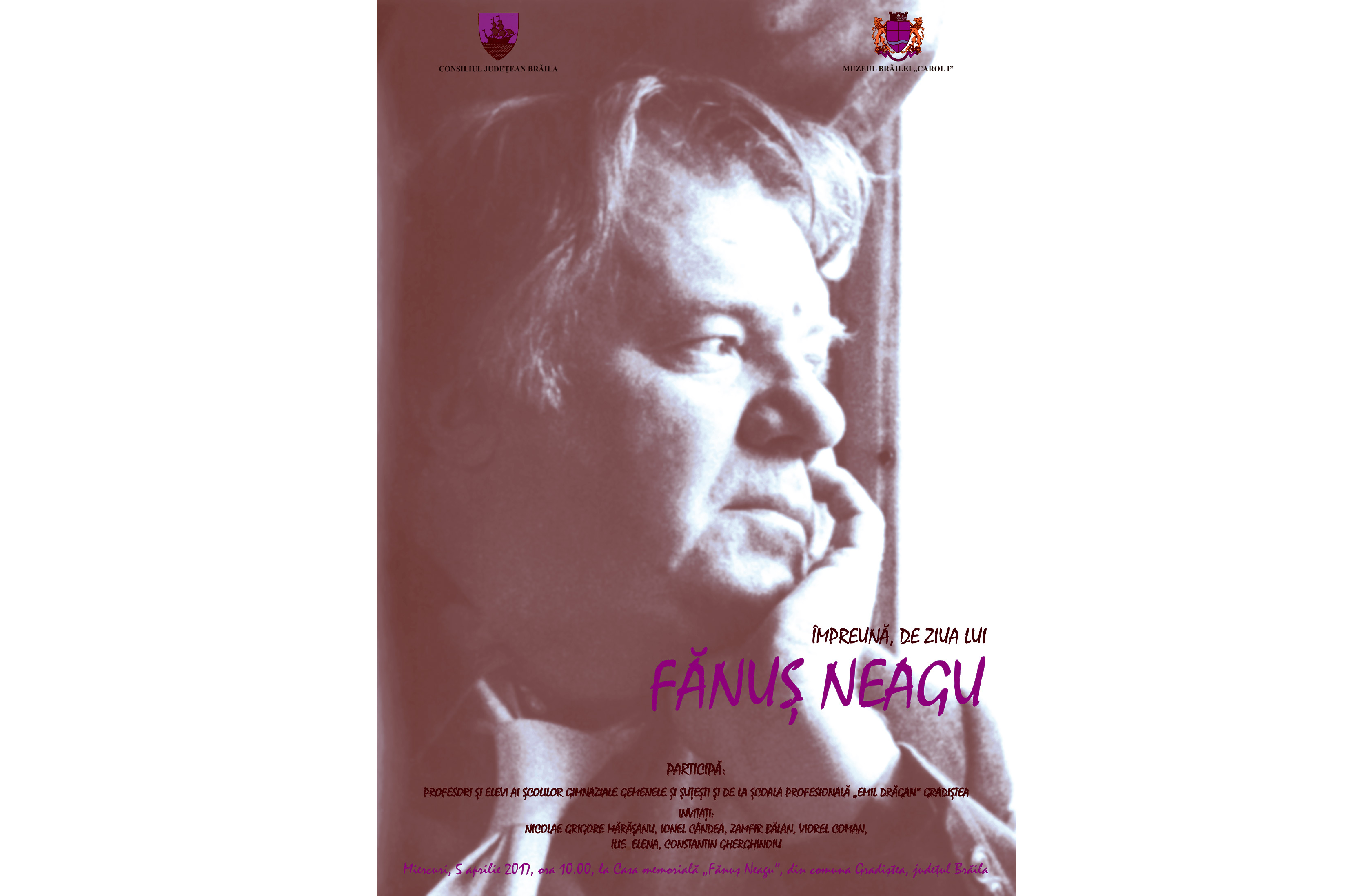 Muzeul Brăilei “Carol I” organizează miercuri, 5 aprilie 2017, de la ora 10.00, la Casa Memorială “Fănuş Neagu” din comuna Gradiştea, judeţul Brăila, un eveniment dedicat zilei de naştere a scriitorului Fănuş Neagu.