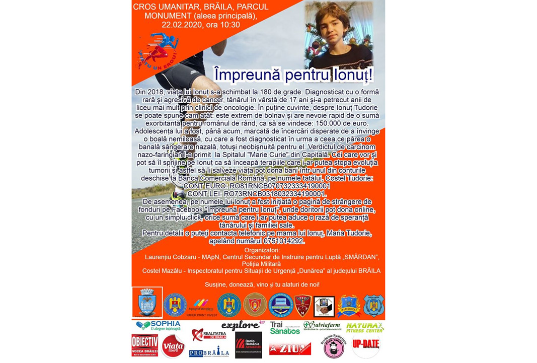 Sâmbătă, 22 februarie, începând cu ora 10.00, în Parcul Monument are loc un nou cros caritabil organizat de maratoniştii Laurenţiu Cobzaru şi Costel Mazâlu. Eroii faptelor bune vă invită să alergaţi şi să susţineţi cauza lui Ionuţ Tudorie, un adolescent minunat, un copil cum rar întâlneşti, dar care se luptă din 2018 cu o boală cumplită: carcinom nazo-faringeal, un tip de cancer foarte rar. În prezent, băiatul trebuie să urmeze urgent un tratament în Germania, iar costurile acestuia se ridica la uriaşa sumă de 150.000 euro, sumă ce nu poate fi decontată în totalitate de Casa Naţională de Asigurări de Sănătate.