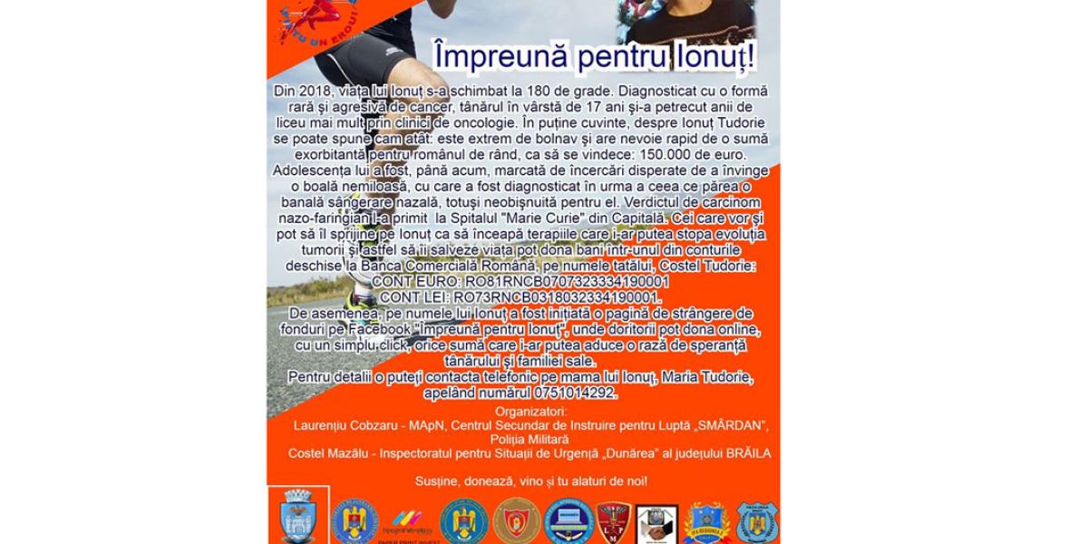 “Atât de puţin dacă poţi ajuta pentru acest suflet minunat ar însemna enorm. Este greu să vezi cum se scurge o viaţă din ochii unui copil, de aceea dorim să facem tot ce e posibil pentru a-l ajuta. Aşadar, indiferent de vârstă, condiţie fizică ori performanţe sportive, sunteţi invitaţi la un cros umanitar, maxim 10 ture, în jurul Orăselul Copiilor. Este distanţa care îi poate aduce eroului Ionuţ, şansa la o noua viaţă, prin plata tratamentului mult prea costisitor pentru familia lui. Fiind o activitate caritabilă si nu o competiţie sportivă, fiecare va alerga sau va merge, atât cât va putea! Şi, în semn de mulţumire şi recunoştinţă, vă va fi înmânată o diplomă de participare, pentru generozitatea si bunăvoinţa dumneavoastră.