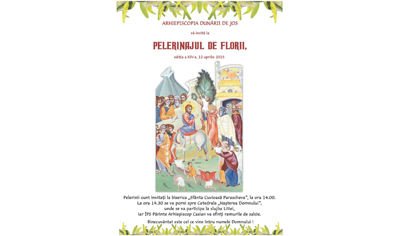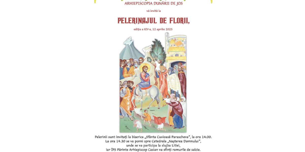 „Sâmbătă, 12 aprilie, în ajunul Praznicului Împărătesc al Floriilor, în municipiile Brăila și Galați, precum şi în alte localităţi din cele două judeţe ale Arhiepiscopiei Dunării de Jos, se va desfăşura tradiţionalul Pelerinaj de Florii, care aminteşte de momentul Intrării Mântuitorului nostru Iisus Hristos în cetatea Ierusalimului”, precizează Biroul de Presă al Arhiepiscopiei Dunării de Jos.