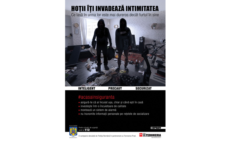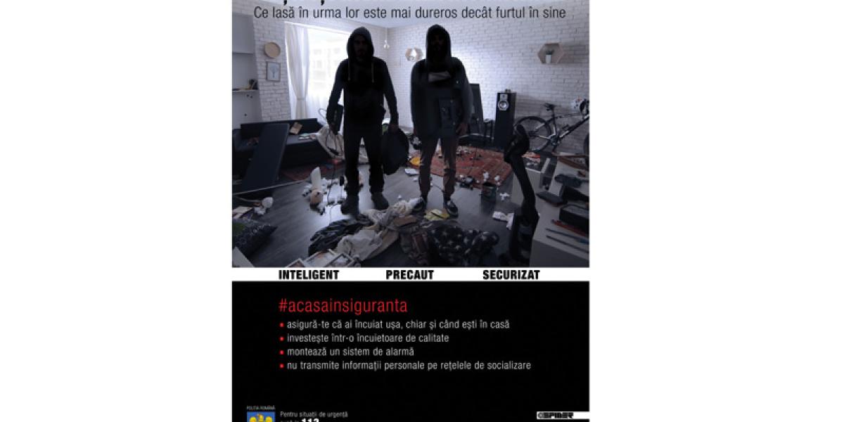 Campanie de prevenire a furturilor din locuinţe “Hoţii îţi invadează intimitatea”. Poliţiştii sunt în acţiune intensă, în perioada decembrie 2019 - februarie 2020. Oamenii vor primi sfaturi utile care să îi ajute să se ferească de hoţi. Activitatea se derulează la nivel naţional.
