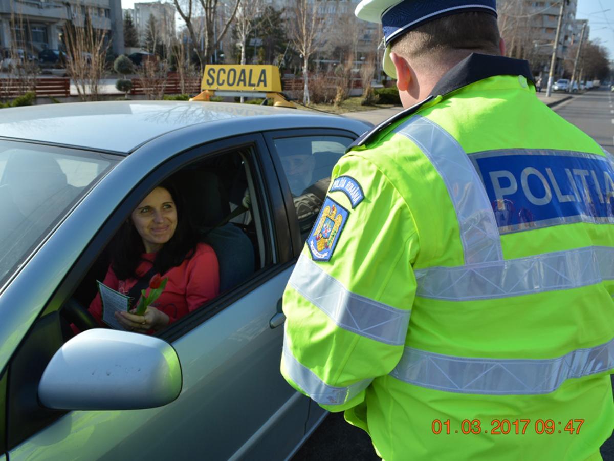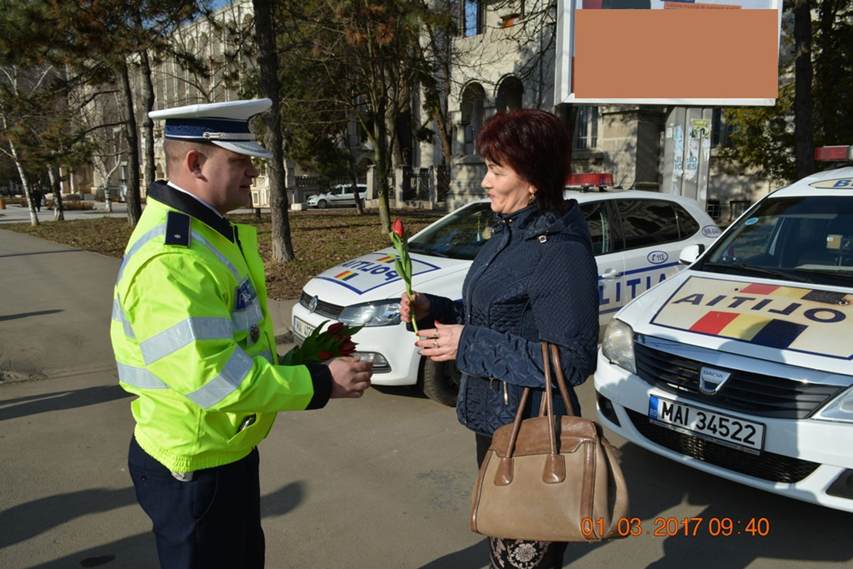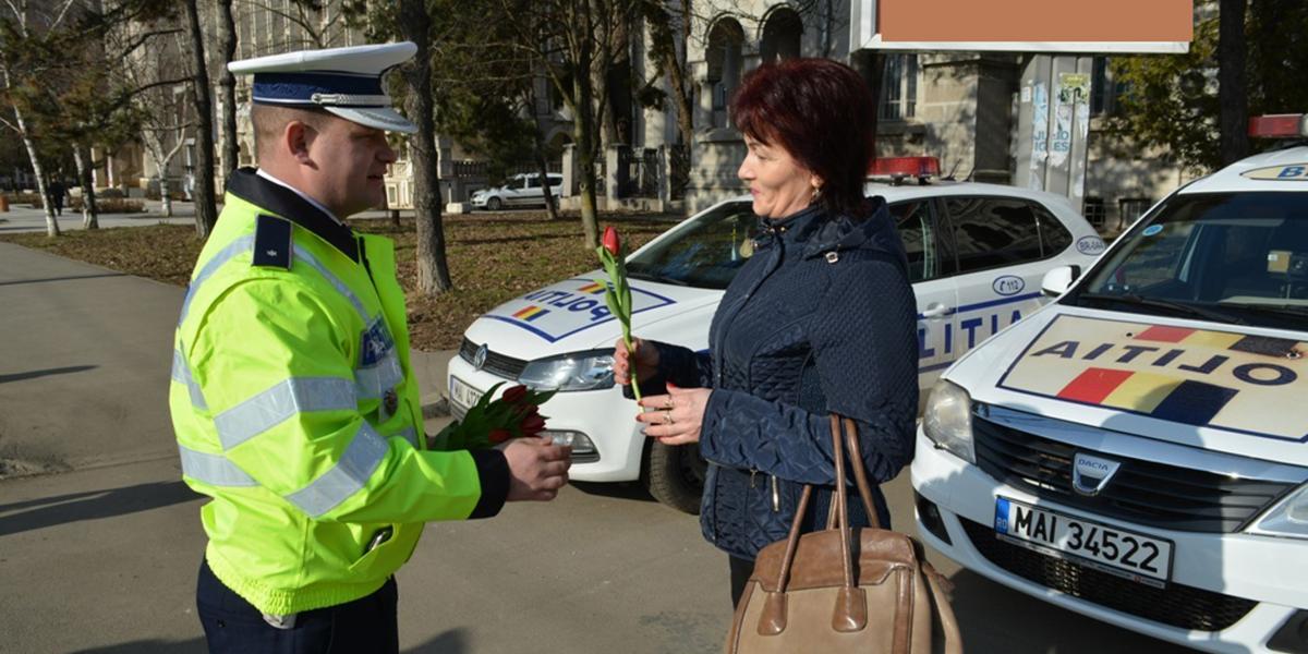 În ziua de 1 Martie, poliţiştii nu aveau cum să lipsească din stradă. De această dată însă, oamenii în uniformă au oferit flori femeilor aflate la volan sau pe stradă, dar nu au uitat să le dea şi sfaturi care să le ajute să se ferească de accidentele rutiere sau de alte infracţiuni.