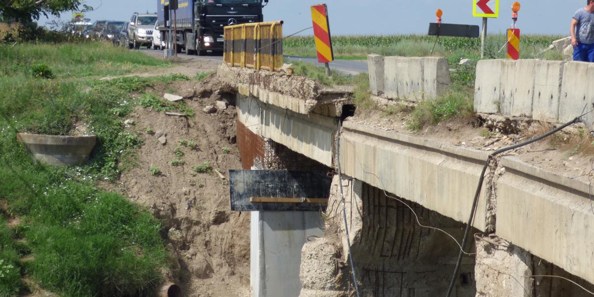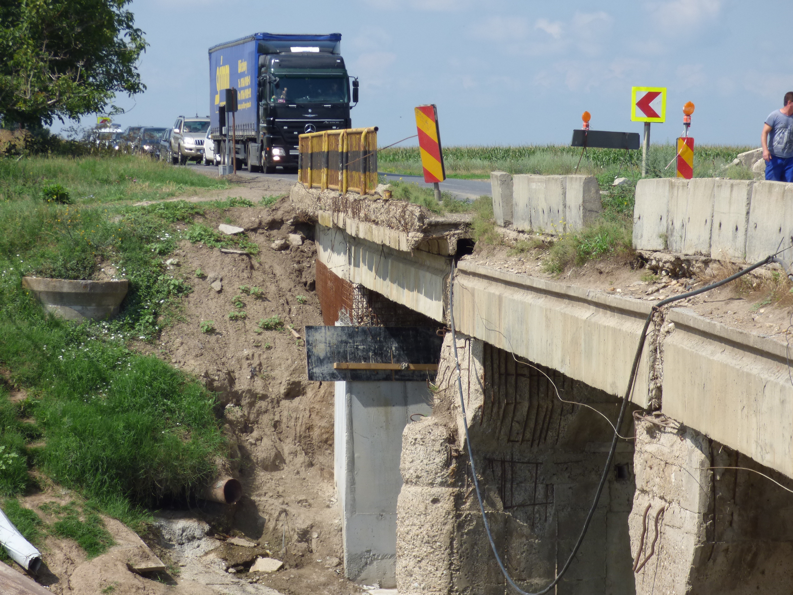 * podul de beton, care trece peste unul dintre cele mai mari canale de irigații din județ, avea nevoie urgentă de reparații capitale * lucrările au început, așa cum se întâmplă de obicei, cu trei luni întârziere * din cauza acestui aspect, constructorul nu a putut să profite de perioada când canalul de irigații era aproape secat * cum a fost nevoie de irigații, ANIF a trebuit să bage apă pe canal, astfel că lucrările se derulează în prezent cu dificultățile inerente situației * constructorul promite, totuși, să respecte termenul de execuție, de 12 luni