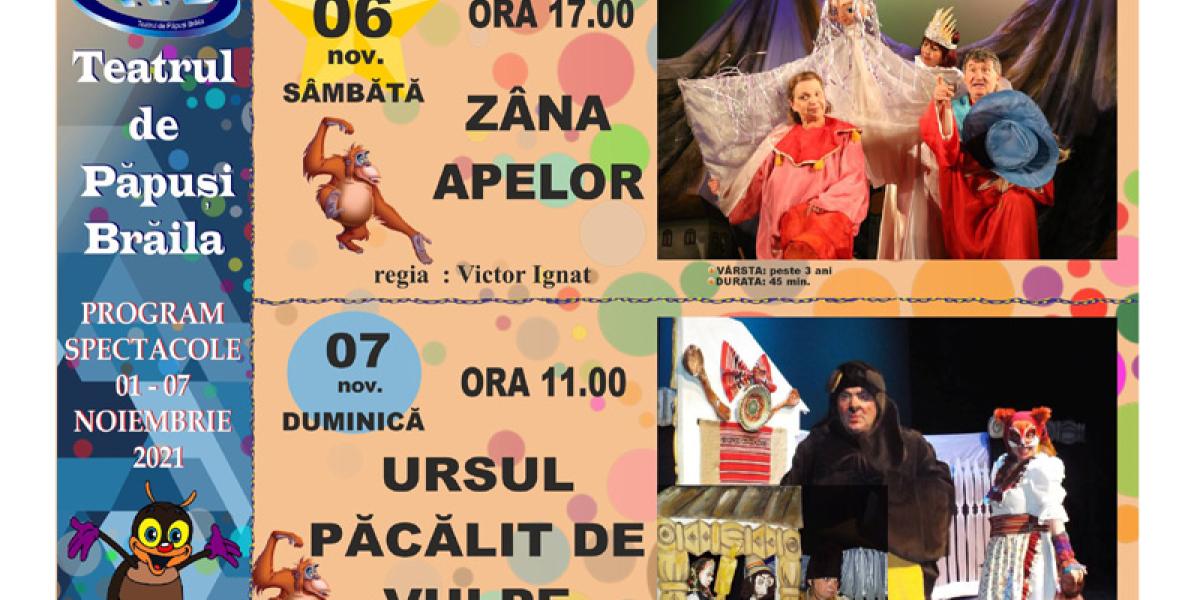 Weekendul acesta copiii sunt așteptați la Teatrul de Păpuși ”Cărăbuș”! Sâmbătă, de la ora 17.00, cei mici pot vedea spectacolul ”Zâna apelor”, regie, scenografie și muzică Victor Ignat. Piesa este adresată copiilor între 4 și 14 ani iar din distribuție fac parte actorii Valentina Lepădatu, Aurora Popescu și Iulian Gheorghe. În ziua următoare, duminică, 7 octombrie, de la ora 11.00, Teatrul de Păpuși ”Cărăbuș” îi invită pe pitici la spectacolul ”Ursul păcălit de vulpe”, adresat copiilor între 3 și 10 ani. Regia piesei este semnată de George Popa, scenografia de Clara Daranga Rasnoveanu, muzica de Ioan Popescu, iar din distribuție fac parte actorii Iulian Gheorghe, Daniela Antonescu, Aurora Popescu, Gabriela Picuș și Sofia-Gabriela Cătrună.
