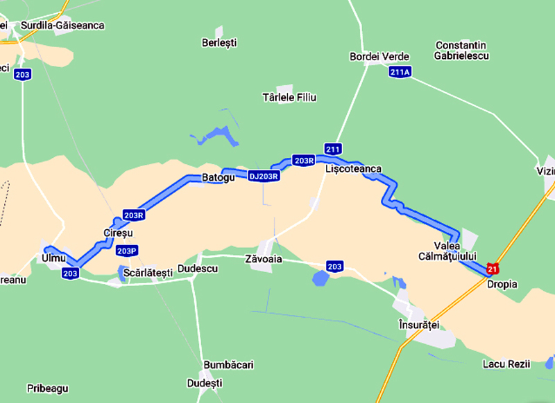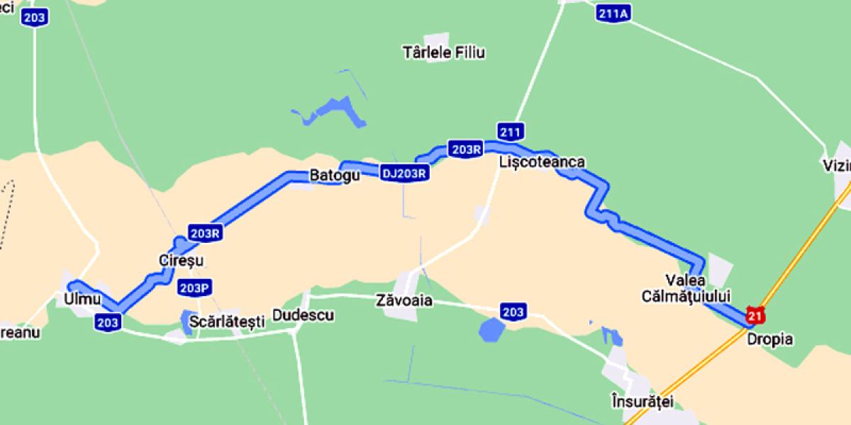 Din raportul de specialitate al Direcției Tehnice și Lucrări Publice, aflăm că DJ203R asigură legătura între drumul județean DJ203 N (Ulmu) și drumul național european E584 (DN21). Mai precis, acesta străbate următoarele localități: Ulmu, Cireșu, Batogu, Ionești și Lișcoteanca cu drumul județean DJ211.