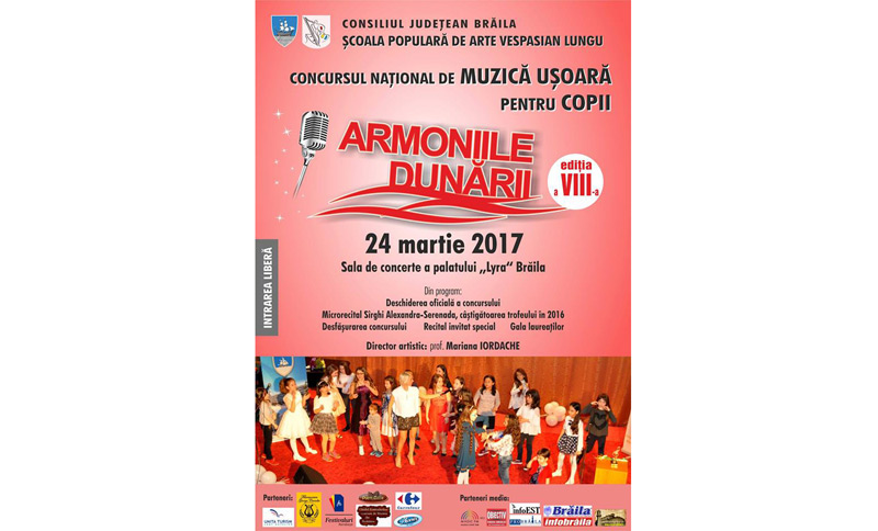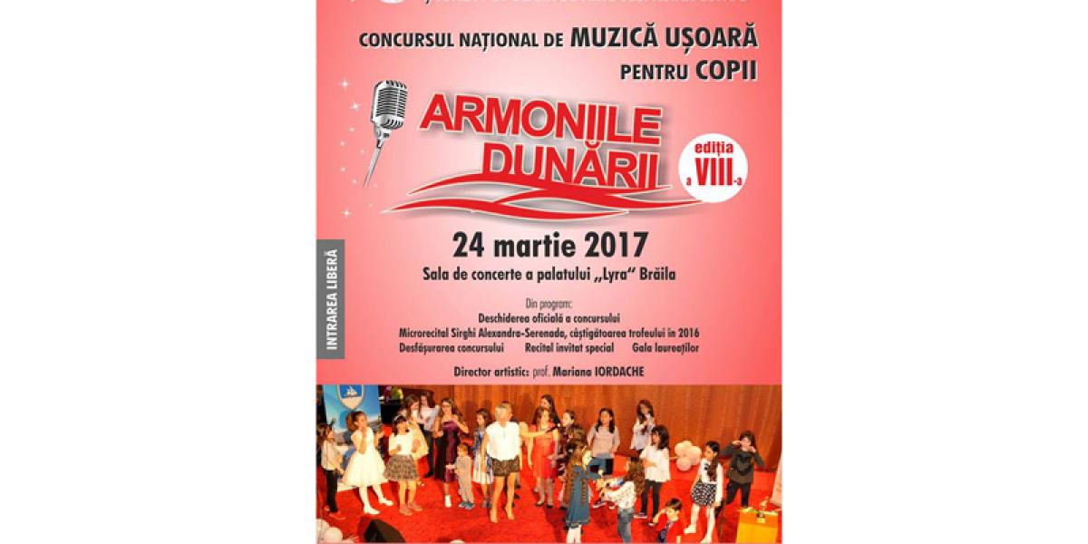 Şcoala Populară de Arte “Vespasian Lungu” Brăila organizează cea de a VIII-a ediţie a Concursului naţional de muzică uşoară pentru copii “Armoniile Dunării” - care se va desfăşura la Brăila, pe 24 martie. Destinat copiilor şi tinerilor cu vârste cuprinse între 7 şi 18 ani, evenimentul va avea loc în sala de concerte a Palatului LYRA şi se doreşte a fi o modalitate de promovare şi stimulare a studiului muzicii uşoare în rândul tinerelor talente, precum şi readucerea în atenţia publicului, a celor mai valoroase creaţii muzicale din componistica românească şi internaţională.