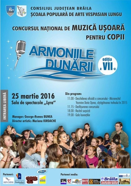 Şcoala Populară de Arte „Vespasian Lungu" Brăila, cu sprijinul Consiliului Judeţean Brăila, organizează pe 25 martie, în Sala de spectacole a Societăţii Muzicale "Lyra", cea de-a şaptea ediţie a concursului naţional de muzică uşoară pentru copii "Armoniile Dunării". Devenit deja tradiţie, concursul este structurat pe trei categorii de vârstă: 7-10 ani, 11-14 ani şi 15-18 ani, iar înscrierile se pot face, pentru concurenţii din judeţul Brăila, până pe 18 martie 2016, ora 12.00, preselecţiile urmând a avea loc în aceeaşi zi, începând cu ora 16.00, la sediul Şcolii Populare de Arte.