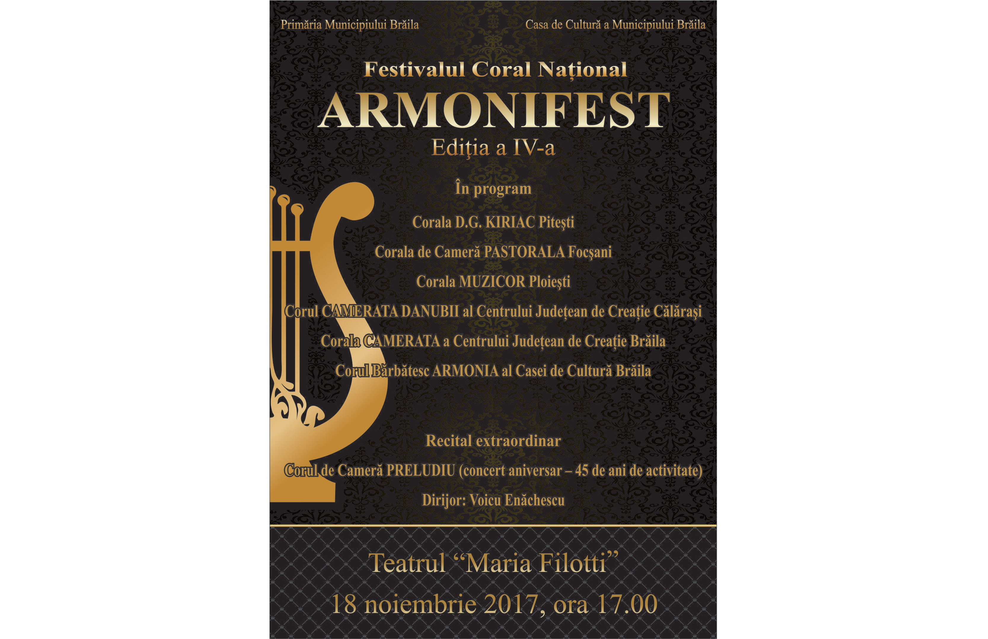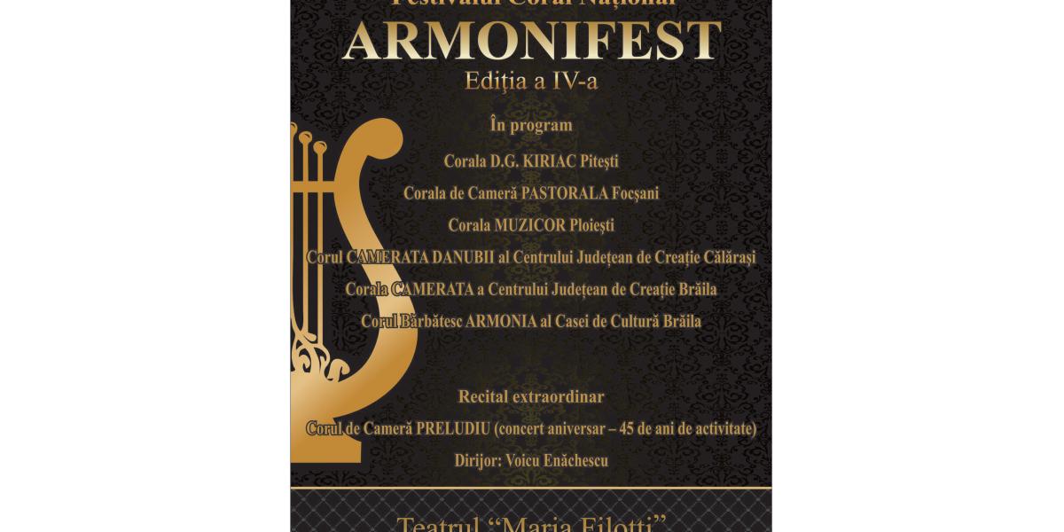 Sâmbătă, 18 noiembrie, începând cu ora 17.00, la Teatrul “Maria Filotti”, se va desfăşura cea de a patra ediţie a Festivalului Coral Naţional “ARMONIFEST”, manifestare organizată de Casa de Cultură a Municipiului Brăila, cu sprijinul Primăriei Municipiului.