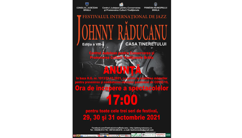 * organizatorii au fost nevoiți să schimbe ora de începere a spectacolelor, pentru toate cele trei seri de festival, din cauza reglementărilor privind combaterea pandemiei * Gala Laureaților are loc duminică, 31 octombrie, la ora 17.00 * Festivalul Internațional de Jazz ”Johnny Răducanu” este dotat cu premii de 13.000 de euro