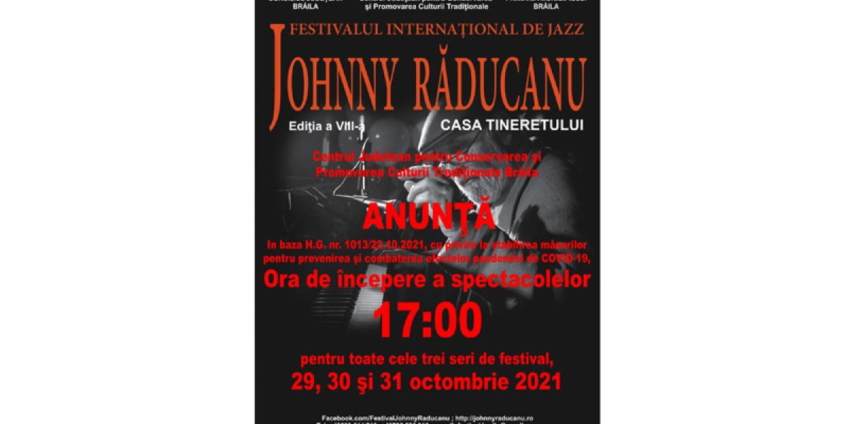Start în cea de a VIII-a Ediție a Festivalului Internațional de Jazz ”Johnny Răducanu”, care se va desfășura, timp de trei zile, începând de astăzi, pe scena Casei Tineretului. Organizatorii festivalului au fost nevoiți să schimbe, însă, ora de începere a spectacolelor, pentru toate cele trei seri de festival - 29, 30 și 31 octombrie - de la ora 19.00 la ora 17.00, din pricina ultimelor reglementări privind combaterea pandemiei de coronavirus.