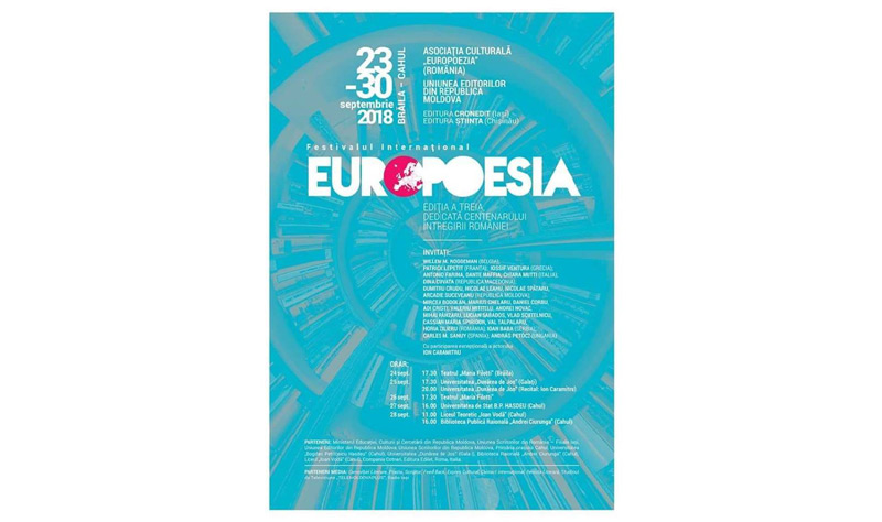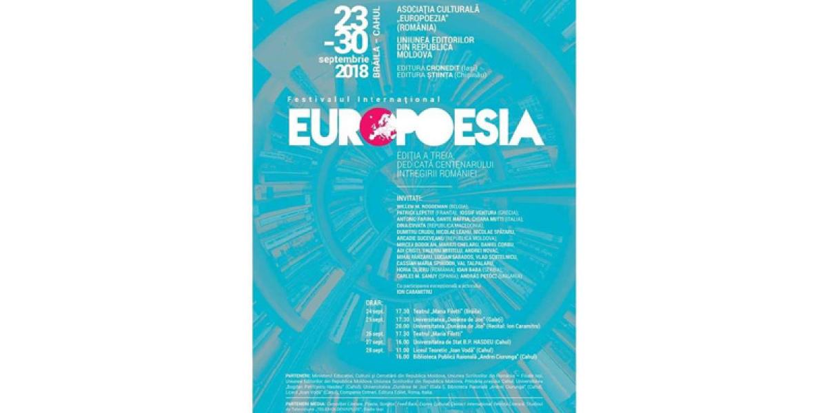 În perioada 23-30 septembrie, va avea loc cea de a III-a ediţie a Festivalului Internaţional EuroPoesia, organizat de Asociaţia Culturală Europoezia, Uniunea Editorilor din Republica Moldova, Editura Cronedit Iaşi şi Editura Ştiinţa din Chişinău. Festivalul se va desfăşura în oraşele Brăila, Galaţi şi Cahul, iar ediţia din acest an este dedicată centenarului întregirii României şi se va bucura de participarea exepţională a actorului Ion Caramitru. Printre invitaţi se numără: Willem M. Roggeman - Belgia, Patrick Lepetit - Franţa, Iossif Ventura - Grecia, Antonio Farina, Dante Maffia, Chiara Mutti - Italia, Dina Cuvata - Republica Macedonia, Dumitru Crudu, Nicolae Leahu, Nicolae Spătaru, Arcadie Suceveanu - Republica Moldova, Mircea Bodolan, Marius Chelaru, Daniel Corbu, Adi Cristi, Valeriu Mititelu, Andrei Novac, Mihai Pânzaru, Lucian Sabados, Vlad Scutelnicu, Cassian Maria Spiridon, Valentin Talpalaru, Horia Zilieru - România, Ioan Baba - Serbia, Charles M.Sanuy - Spania şi Andras Petocz - Ungaria.
