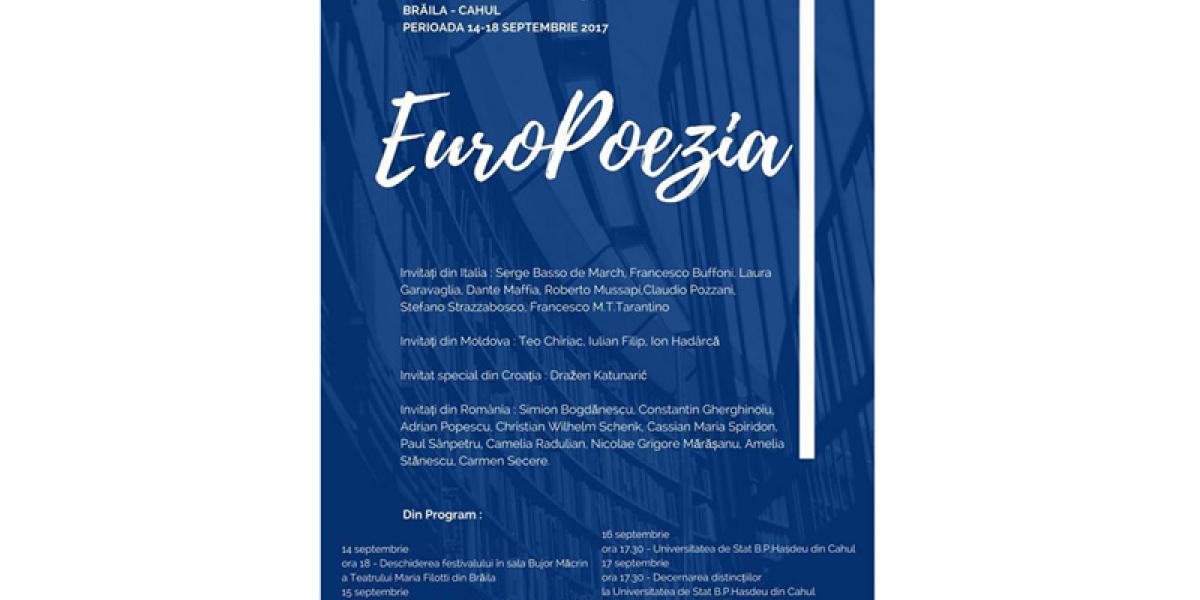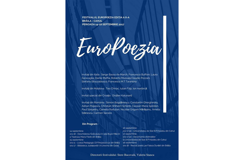 Joi, 14 septembrie 2017, ora 18.00, la Teatrul “Maria Filotti” din Brăila, sala Bujor Macrin, are loc deschiderea celei de a doua ediţii a Festivalului Internaţional Euro Poezia, avându-i ca directori pe Stere Bucovală şi Valeriu Stancu. Manifestarea se derulează între 14 şi 18 septembrie, perioadă în care vor fi prezenţi la Brăila poeţi din mai multe ţări europene. Dacă în prima ediţie au fost invitaţi scriitori din Franţa, anul acesta vor fi prezenţi poeţi din Italia, din Cahul- Republica Moldova, un invitat special din Croaţia şi poeţi din România. Printre invitaţi se vor afla: Serge Basso de March, Francesco Buffoni, Laura Garavaglia, Dante Maffia, Roberto Mussapi, Claudio Pozzani, Stefano Strazzabosco, Francesco M.T.Tarantino din Italia, Teo Chiriac, Iulian Filip, Ion Hadârcă din Republica Moldova şi un invitat special din Croaţia, Drazen Katunaric. Printre invitaţii din România amintim: Simion Bogdănescu, Constantin Gherghinoiu, Adrian Popescu, Christian Wilhelm Schenk, Cassian Maria Spiridon, Paul Sânpetru, Camelia Radulian, Nicolae Grigore Mărăşanu, Amelia Stănescu, Carmen Secere.