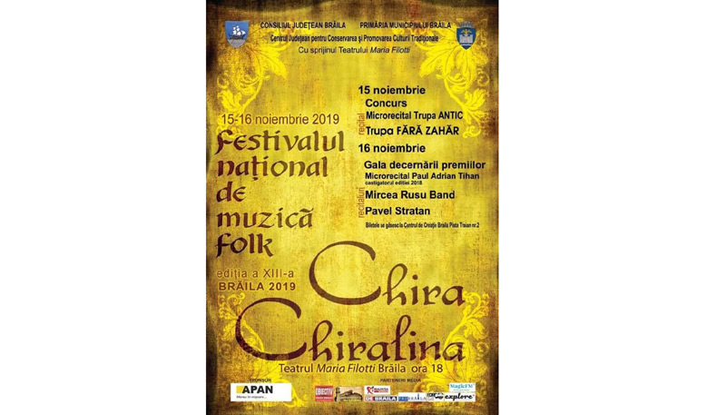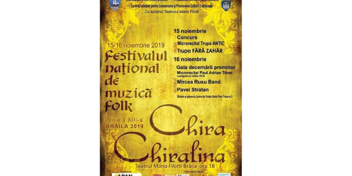 Cea de a XIII-a ediţie a Festivalul Naţional de Folk “Chira Chiralina” se va desfăşura în acest an în perioada 15-16 noiembrie. Organizat de Consiliul Judeţean Brăila, Centrul Judeţean pentru Conservarea şi Promovarea Culturii Tradiţionale, cu sprijinul Primăriei Municipiului Brăila şi al Teatrului “Maria Filotti” festivalul are drept scop descoperirea şi promovarea de noi talente interpretative şi de creaţie ale muzicii folk, cât şi de continuare a unei importante tradiţii a genului la Brăila.