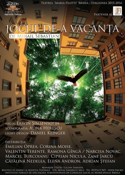 După un amplu proces de restaurare, se redeschide Sala Mare a Teatrului "Maria Filotti" şi se dă oficial startul stagiunii 2015-2016. Sâmbătă, 19 şi duminică, 20 septembrie, de la ora 18.00, Teatrul "Maria Filotti" propune o producţie eveniment, în avanpremieră, spectacolul "Jocul de-a vacanţa" de Mihail Sebastian, regia: Erwin Şimşensohn, scenografia: Alina Herescu, light design: Daniel Klinger. În distribuţie: Emilian Oprea, Corina Moise, Valentin Terente, Ramona Gîngă/Narcisa Novac, Marcel Turcoianu, Ciprian Nicula, Zane Jarcu, Cătălina Nedelea, Elena Andron, Adrian Ştefan.