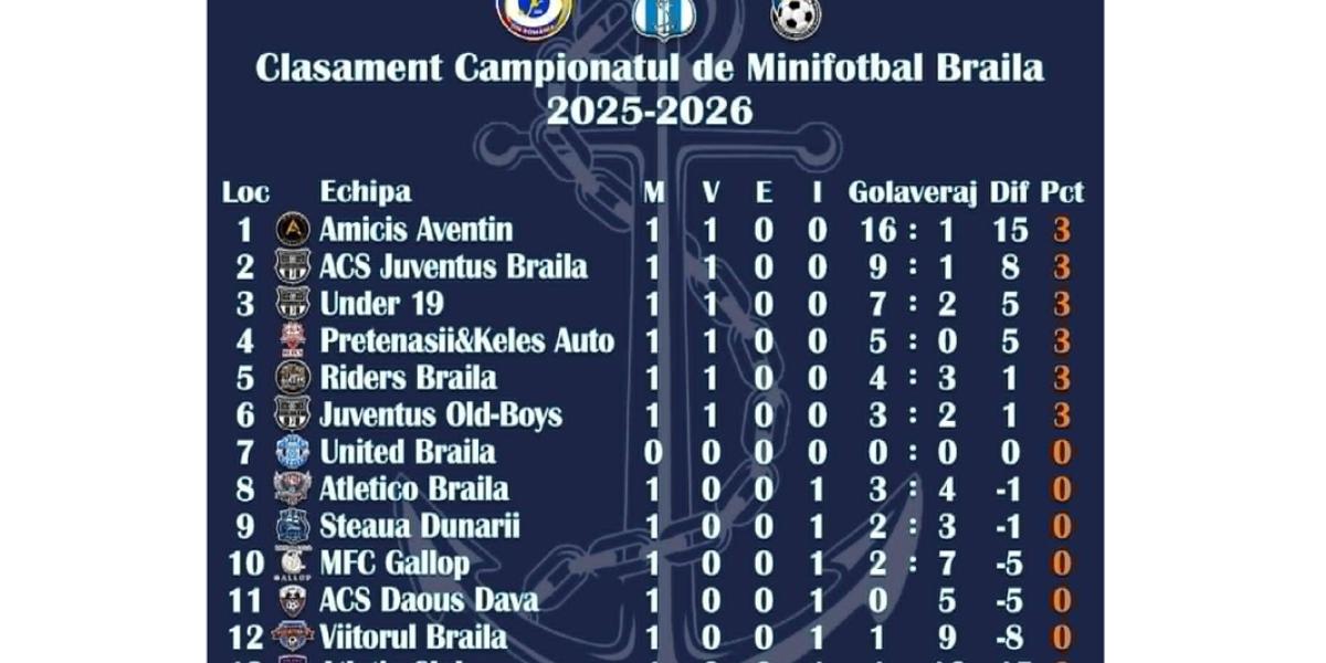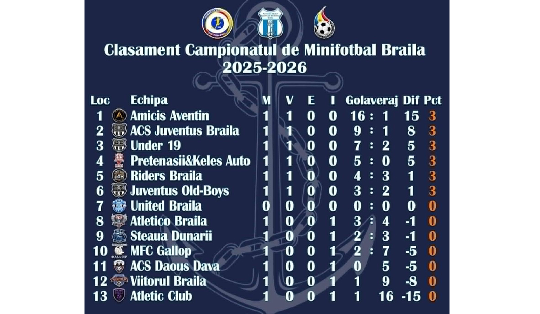 Scorul primei etape a Campionatului de Minifotbal Brăila a fost stabilit de Amicis Aventin, locul al 4-lea în ediția precedentă a acestei competiții, care s-a impus cu 16-1 în partida cu Atletic Club. După cum o arată și scorul, jocul a fost la discreția celor de la Amicis Aventin, care deja și-au anunțat intenția de a candida la un loc pe podium. Iar cel mai bun jucător de pe teren, care a devenit și golgheterul primei etape, a fost Dragoș Mucuță, autor a 7 goluri.