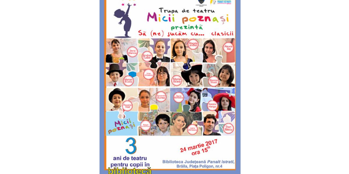 Vineri, 24 martie 2017, ora 15.00, în holul de intrare al Bibliotecii Judeţene “Panait Istrati” Brăila va avea loc spectacolul „Să (ne) jucăm cu… clasicii”, susţinut de Trupa de teatru pentru copii „Micii Poznaşi” din cadrul instituţiei.