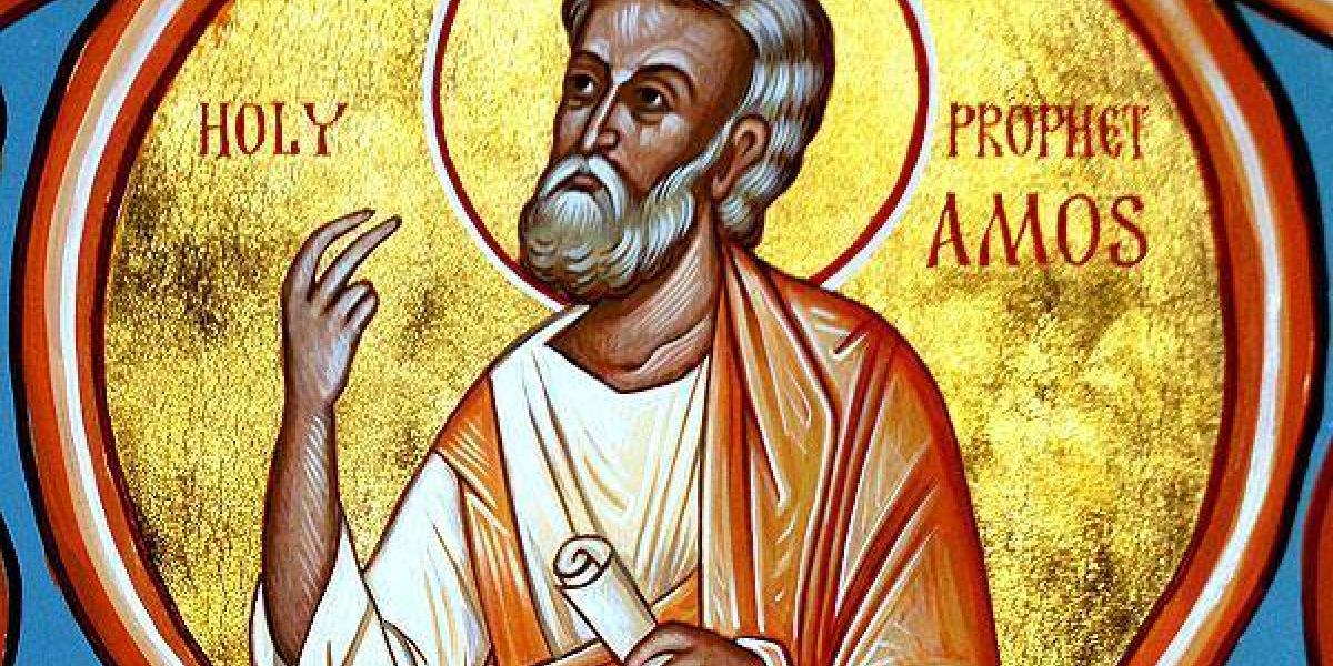 Sfântul Proroc Amos s-a născut în satul Tecoa de lângă Betleem și a trăit în secolul al VIII lea î.Hr. A păzit turmele de porci ale unui om bogat din Ierusalim, până la alegerea sa ca proroc. Începutul prorocirii lui a fost pe vremea împăratului Iudeei Ozia, cel din Ierusalim, și în vremea împăratului lui Israel Ieroboam, cel din Samaria. Amos l-a certat pe regele Ozia și pe preoții lui păgâni pentru închinarea la idoli și a întors poporul de la închinarea la vițeii de aur.