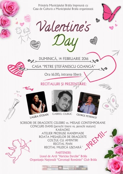 Primăria Municipiului Brăila şi Casa de Cultură a Municipiului au pregătit o petrecere dedicată cuplurilor, pe 14 februarie, la Casa "Petre Ştefănescu Goangă". Îndrăgostiţii sunt aşteptaţi la eveniment începând cu ora 16.30.