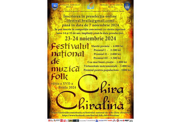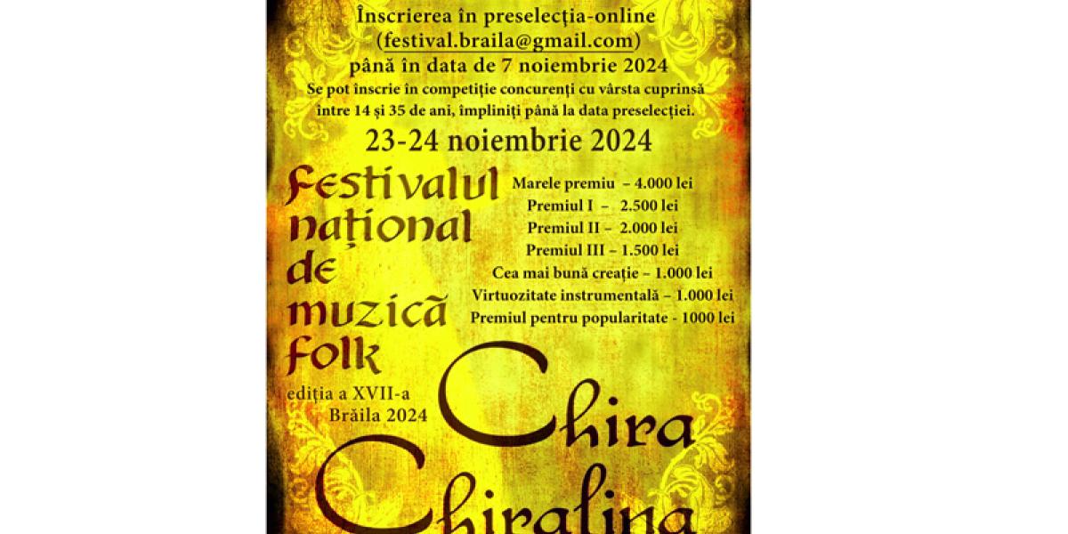 Consiliul Județean Brăila, prin Centrul Județean pentru Conservarea și Promovarea Culturii Tradiționale Brăila (Centrul de Creație) și Primăria Municipiului Brăila organizează, în perioada 23 - 24 noiembrie, cea de a XVII-a ediție a Festivalului Național de Folk „Chira Chiralina”.