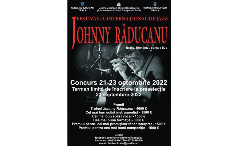 * cea de-a IX-a ediție a Festivalului Internațional de Jazz Johnny Răducanu este organizată de Centrul de Creație Brăila, în colaborare cu Consiliul Județean și Primăria Municipiului Brăila * festivalul se va desfășura în perioada 21-23 octombrie, la Casa Tineretului * Trofeul Johnny Răducanu este însoțit de un cec de 4.000 de euro