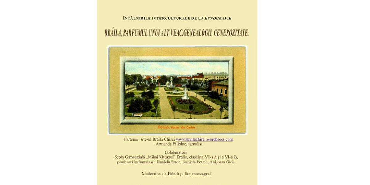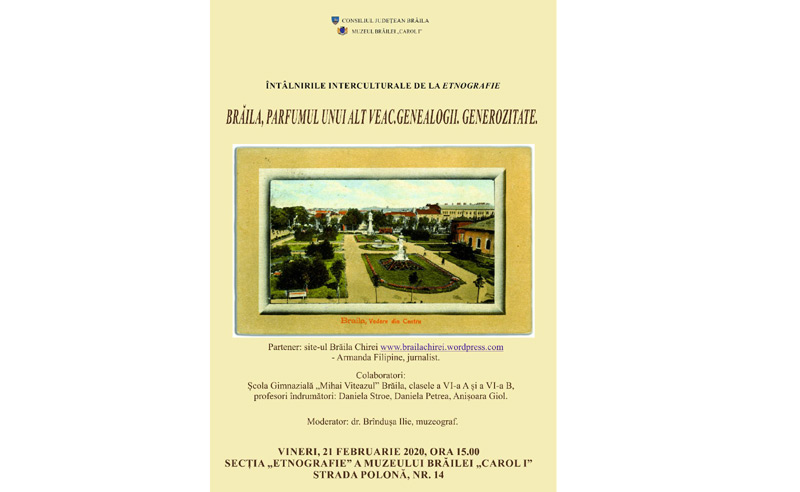 Vineri, 21 februarie, de la ora 15.00, la secţia de Etnografie a Muzeului Brăilei “Carol l” din Strada Polonă, nr. 14, are loc o nouă activitate în cadrul proiectului Întâlnirile interculturale de la Etnografie.Tema întâlnirii este “Brăila, parfumul unui alt veac. Genealogii. Generozitate” şi este realizată în colaborare cu Şcoala Gimnazială “Mihai Viteazul” Brăila şi moderată de dr. Brînduşa Ilie, muzeograf.