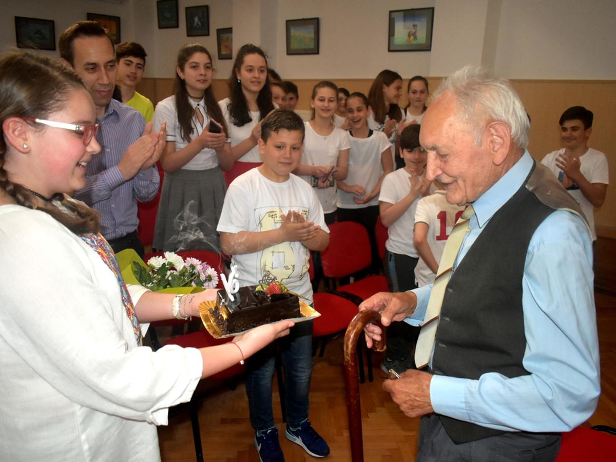 Deoarece aniversarea celor 96 de ani a fost în urmă cu două săptămâni, militarii Flotilei Fluviale împreună cu copiii i-au făcut o surpriză invitatului, dăruindu-i un buchet de flori, un tort şi cântându-i în cor “La multi ani!”.