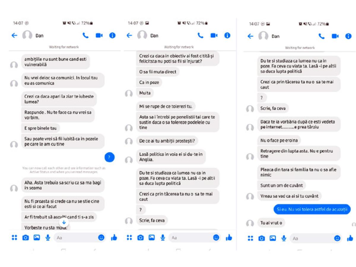 Prezentăm mai jos stenogramele mesajelor, aşa cum reies din capturile de ecran puse la dispoziţia redactorilor „Obiectiv” de către Daniela Pascale. Sunt cele mai recente mesaje şi cele care au determinat-o pe politiciana liberală să depună plângere la Parchet. Şantajul a venit de pe un cont de Facebook cu numele „Dan”