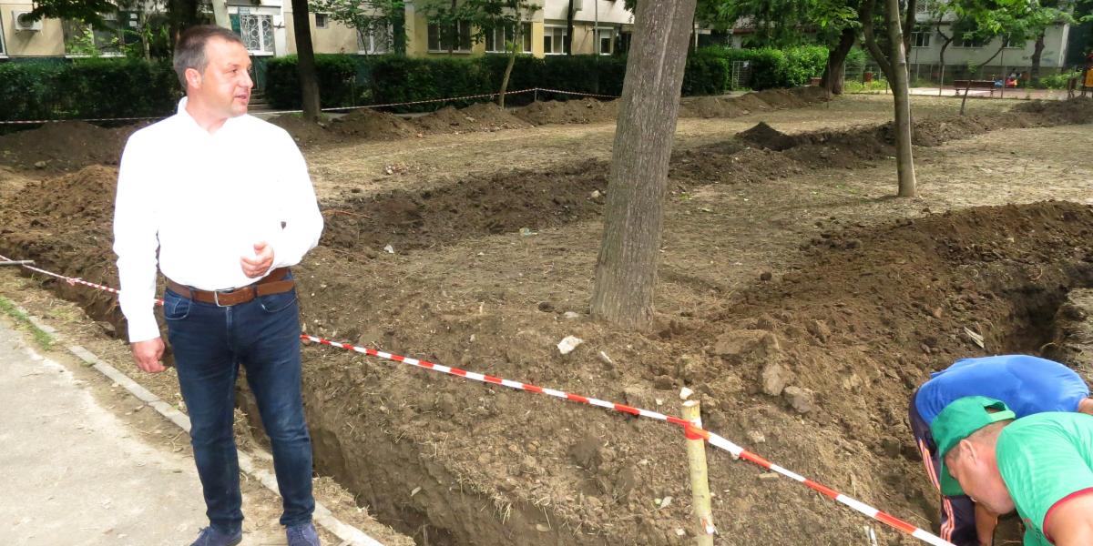 Odată ajunşi acolo, am observat doi muncitori care săpau un şanţ în care urmează să fie amplasate cablurile pentru sistemul de iluminat, sistemul de supraveghere video, dar şi sistemul de irigat al gazonului. Totul în prezenţa constructorului. Fosta centrală termică era înconjurată de moloz şi materiale de construcţii. Edilul-şef a ţinut să puncteze că zona a fost curăţată de vegetaţia neîngrijită.