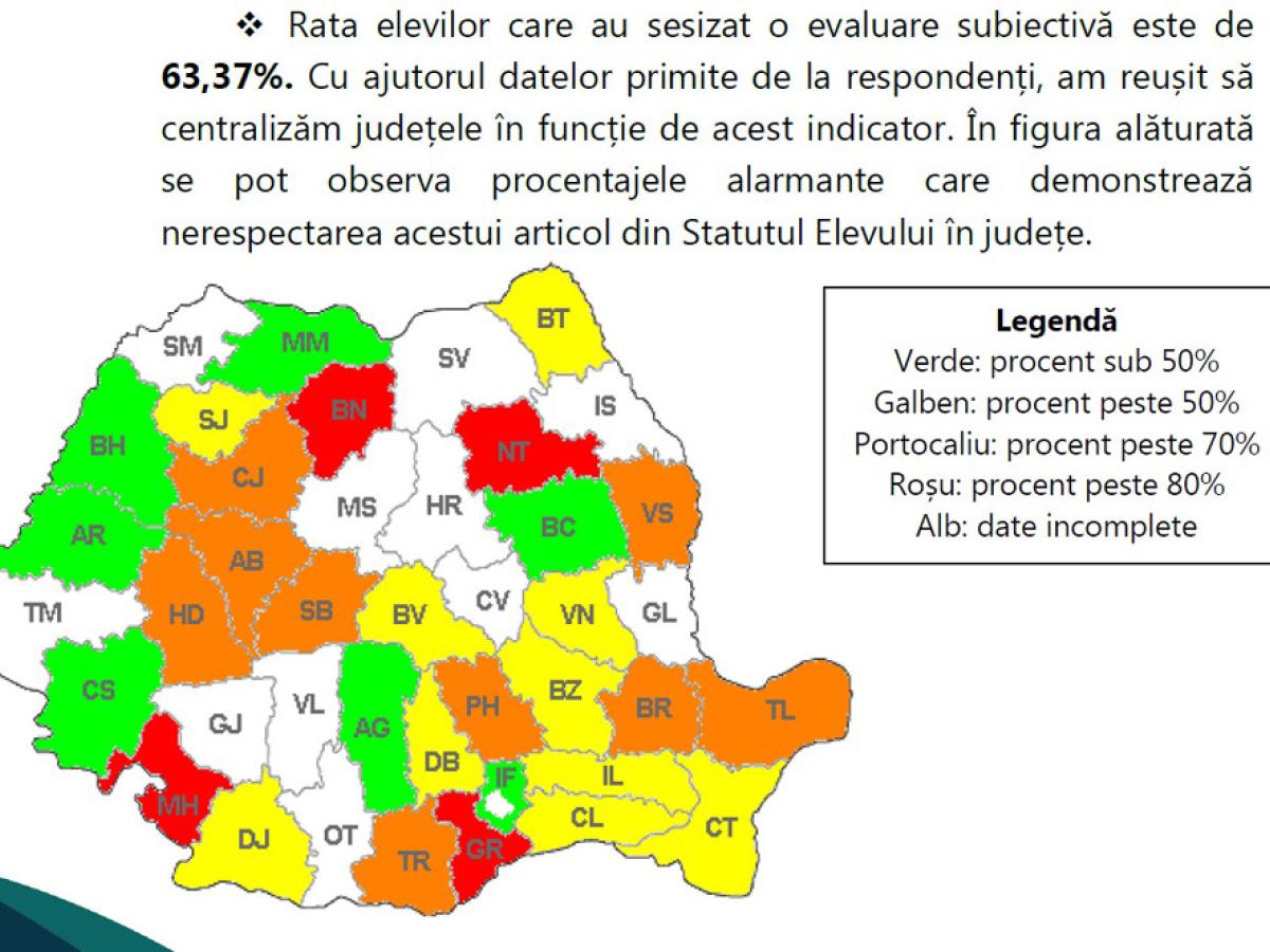 “Rata elevilor care au sesizat o evaluare subiectivă este de 63,37%. Dintre aceştia, conform răspunsurilor date de elevi, doar 25,88% şi-au exercitat dreptul de a contesta rezultatele evaluărilor scrise. Dintre cei care şi-au exercitat dreptul de a contesta rezultatele evaluării lucrărilor scrise, mai puţin de jumătate consideră că au fost îndreptăţiţi în urma contestaţiei. Mai mult, rata elevilor care au observat ostilitate din partea profesorului după exercitarea acestui drept este de 53,85%, fapt care aduce din nou în atenţia noastră ignorarea conceptului de «sistem de învăţământ centrat pe elev – unde elevul este beneficiarul primar»“, se precizează în document.