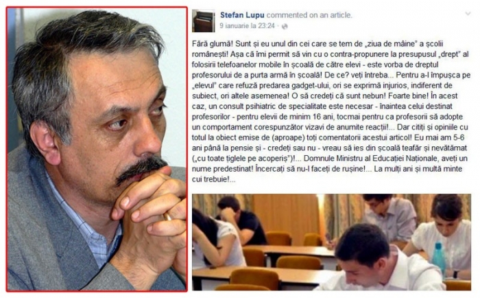 În postarea respectivă (vezi foto), odată mesajul scos din context, pare că profesorul Ştefan Lupu pledează pentru acte de violenţă la nivelul relaţiei profesor- elev, însă, privit în ansamblu, ca şi comentariu la un articol la fel de "îngrijorător", mesajul nu face decât să completeze starea şcolii şi a celor care fac parte din ea: tulbure, violentă, conflictuală.