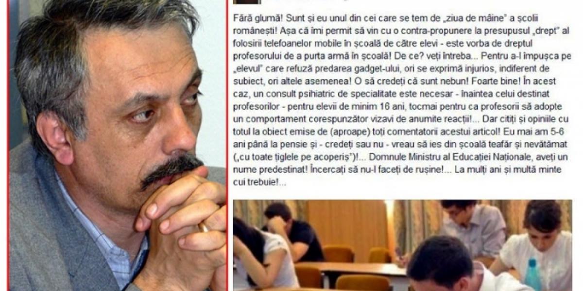 Ba chiar profesorii înşişi îşi dau cu stângul în dreptul. Nu mai departe de ieri, cazul care a inflamat opinia publică a fost construit chiar la Brăila, după ce profesorul Ştefan Lupu, de la Liceul de Artă "Hariclea Darclee", dirijor şi întemeietor al Grupului "Trison" - altfel un nume greu în cultura muzicală locală -, a postat pe Facebook un mesaj la un articol al unui dascăl din Sibiu: "(...) Aşa că îmi permit să vin cu o contra-propunere la presupusul drept al folosirii telefoanelor mobile în şcoală de către elevi - este vorba despre dreptul profesorului de a purta armă în şcoală! De ce? veţi întreba...Pentru a-l împuşca pe elevul care refuză predarea gadget-ului ori se exprimă injurios, indiferent de subiect ori alte asemenea (...)".