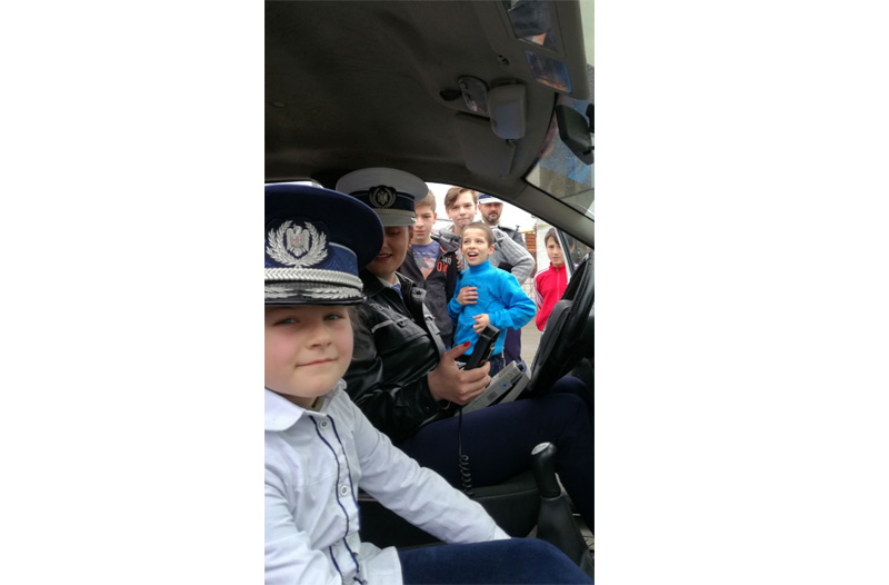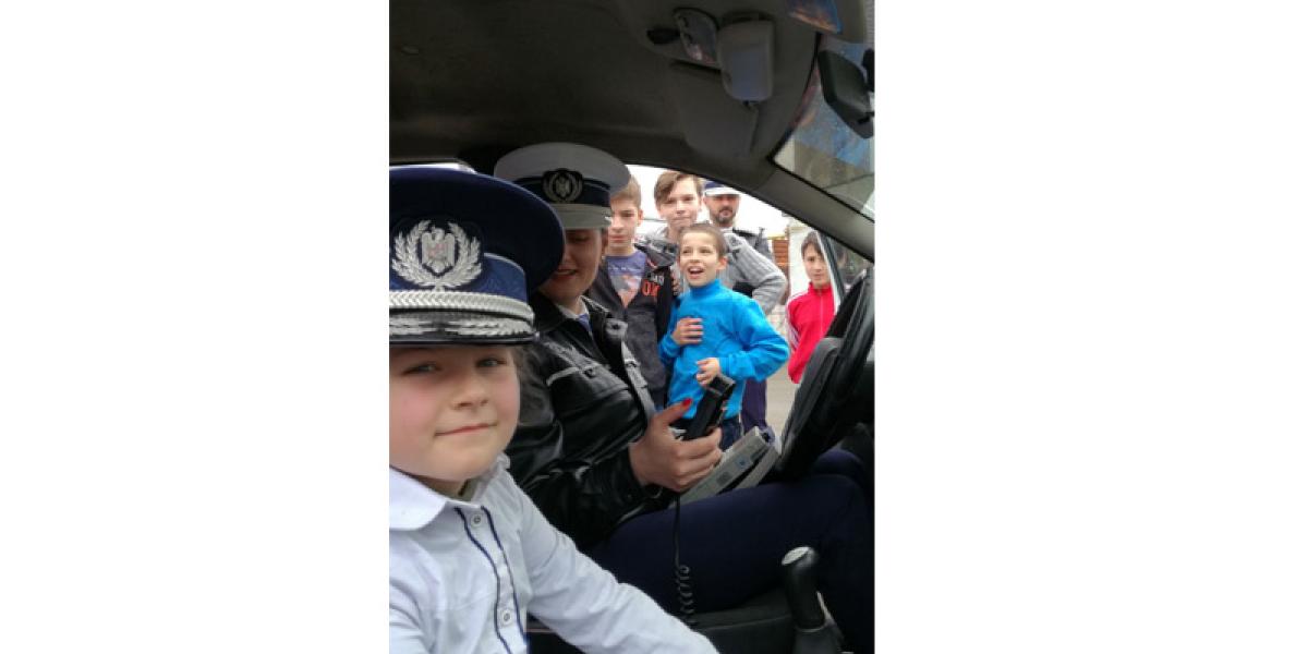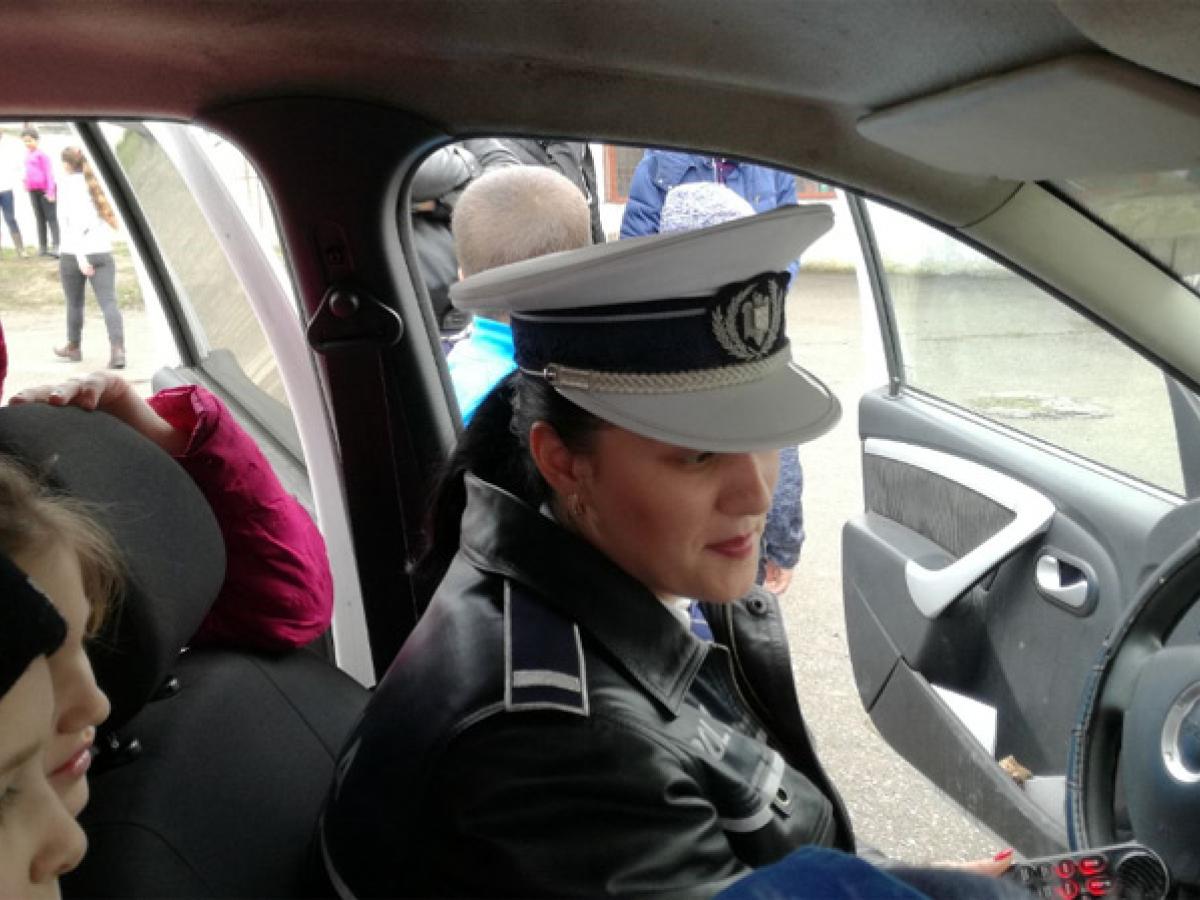 Poliţiştii le-au arătat celor mici şi importanţa purtării centurii de siguranţă, prin punerea în scenă a unui mic spectacol. Astfel, folosindu-se de o cutie, care s-a vrut a fi autovehiculul, un ou – pasagerul şi bandă adezivă – centura de siguranţă, oamenii legii le-au arătat ce se întâmplă în cazul unui accident rutier, dacă pasagerul poartă centura de siguranţă şi ce poate păţi cel care “uită” să o folosească. La final, cu o mare bucurie, cei mici au urcat în autospeciala de poliţie rutieră, au văzut cum funcţionează aparatul de înregistrare a vitezei autovehiculelor şi au probat caschetele poliţiştilor.