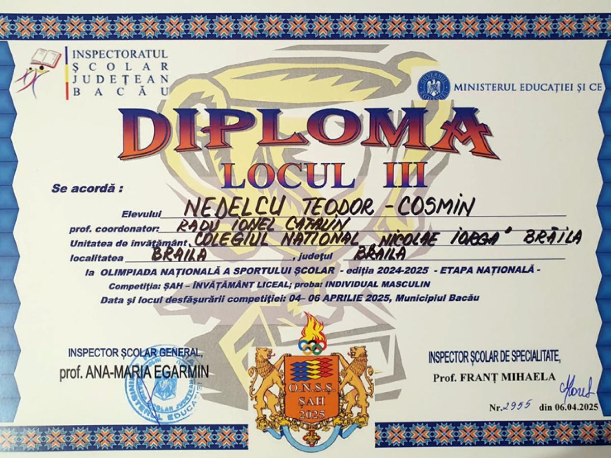 La ediția din acest an a turneului de șah din cadrul Olimpiadei Naționale a Sportului Școlar (ONSS), competiție rezervată elevilor de liceu, șahistul brăilean Teodor Cosmin Nedelcu, elev în clasa a XI-a la Colegiul Național “Nicolae Iorga”, a obținut medalia de bronz.